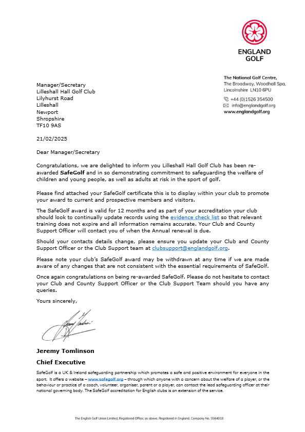 Please click the links below to view all about our golf club, what we aim to achieve, how the club is run and how we keep our valued members and visitors safe.